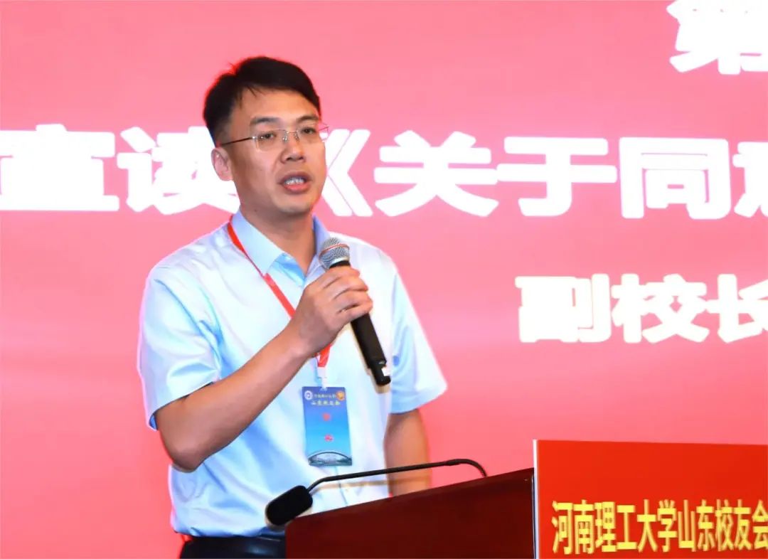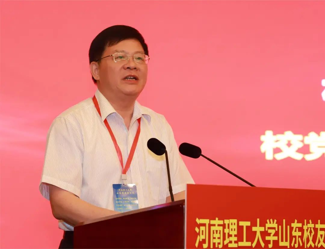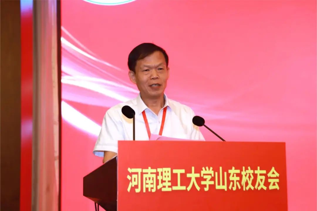邹友峰向山东校友会授旗并发表热情洋溢的讲话。他简要介绍了学校近年来各项事业取得的成就,对山东校友为当地经济社会发展做出的贡献、为母校赢得的荣誉表示肯定。邹友峰指出,山东校友会的成立,进一步架起了山东校友与母校联系的桥梁,搭建了校友之间沟通交流的平台。他希望山东校友会一要加强自身建设,强化与兄弟校友会间的交流,学习先进办会经验,积极搭建联络平台,认真谋划联谊活动,把更多校友团结在校友会平台上;二要密切校友与母校的联系,加强校友单位与母校在协同育人、科技创新、成果转化、招生就业等方面的交流,促进校友与母校合作共赢、共同发展;三要凝聚校友的聪明才智,引导广大校友积极投身山东经济社会发展,为推进中国式现代化山东实践贡献理工人新的智慧和力量。