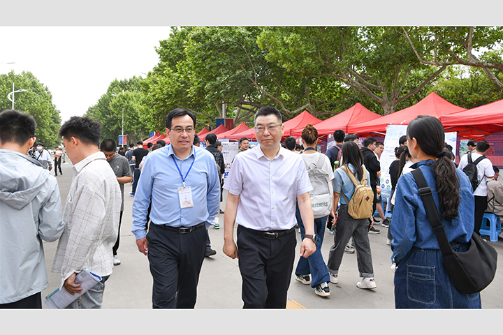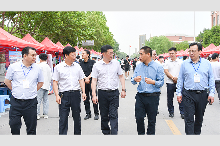 本网讯(通讯员 周申华/文 记者 李为群/图)5月11日,第七届中国•河南招才引智创新发展大会“引才聚焦 智汇怀川”焦作系列活动暨学校(焦作分市场)双选会在我校南校区明德广场举行。校长赵同谦、校党委副书记解伟亲临活动现场考察指导工作,并与用人单位及学生进行了亲切交流。河南省人才交流中心副主任梁小选、焦作市人力资源和社会保障局副局长于同文莅临活动现场进行了巡视指导。