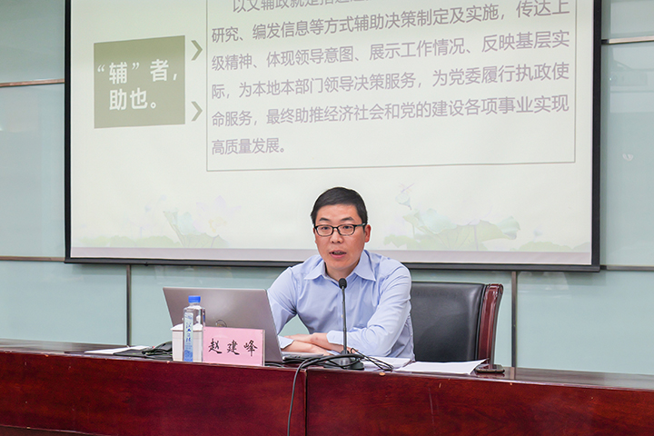 省委政策研究室综合一处副处长赵建峰围绕《关于文稿服务的认识和体会》主题作首场辅导报告。