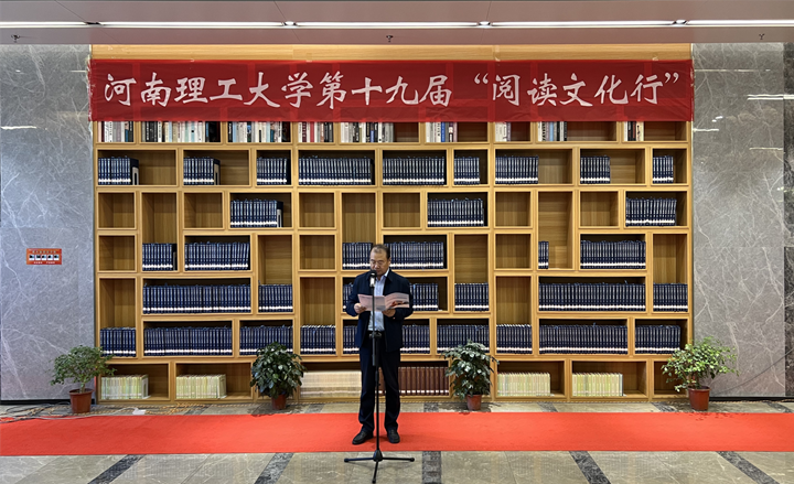 图书与档案馆馆长海林鹏在致辞中表示,中华民族是一个热爱阅读、文化灿烂的民族。读书是一直是我们的优良传统。推进全民阅读,是赓续中华文脉、建设中华民族现代文明的重要举措。以习近平同志为核心的党中央高度重视全民阅读工作,自2014年开始,“全民阅读”被连续11次写入政府工作报告。他强调大学图书馆是推进全民阅读、建设书香校园的主阵地,要扎实做好文献资源建设、服务模式创新、阅读空间优化,激发师生阅读热情,浓郁校园阅读氛围,引领校园阅读风尚,锻塑校园文化风骨,打造书香理工,助力书香中原、书香中国建设。