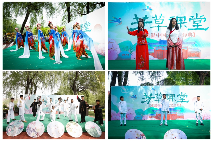 春风扶柳,草长莺飞。“芳草课堂”随即开课,以“重温中国文化之经典”为主题,经典诵读和歌舞表演交替进行,“太极论道悟哲理”“诗词歌赋赏春天”“舞袖翩翩感节气”“品茶听戏知古意”四个篇章精彩纷呈。琴音悠扬、书声琅琅,中外师生共同诵读《周易》《道德经》《黄帝内经》《中庸》《论语》等中国典籍中的哲理名句,共同吟唱二十四节气相关的诗词歌赋,感悟中国文化智慧、品味中国语言魅力,增强中国文化认同。诵读之余,还有中外师生共同带来的精彩演出轮番上演。《太极韵味》尽显太极拳的刚柔并济、超然洒脱;古筝弹奏《春分》声情切切、绵延悠长;《上春山》唱响了春天的序曲,《袖舞翩跹》更是“清歌翩霓裳,倩影舞悠然”;豫剧《花打朝》高亢、明快的唱腔将“七奶奶”的形象跃然呈现,一曲《万疆》唱出了华夏之壮美、山河之辽阔。最后,由国际学生合唱的《我爱你中国》将活动推向了高潮,句句情真意切,深入心扉,唱出了在座每一位观众的心声。