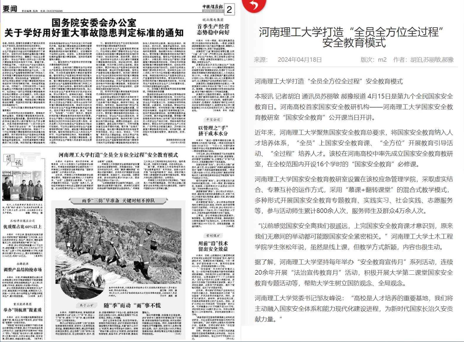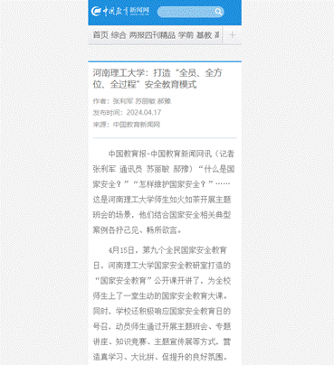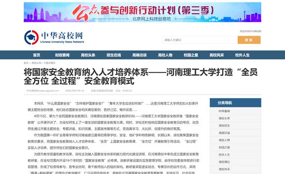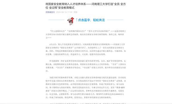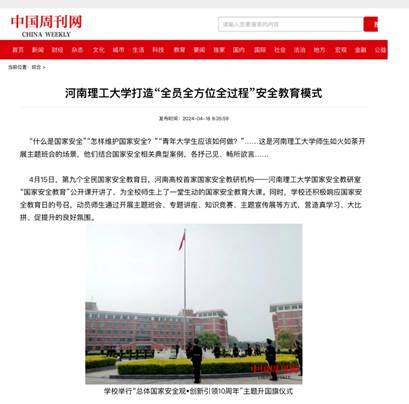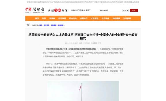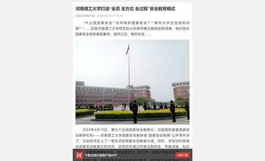 作为我国第一所矿业高等学府和河南省建立最早的高等学校,安全、地矿学科特色鲜明,长期以来,该校聚焦国家安全教育总要求,将国家安全教育纳入人才培养体系,“全员”上国家安全教育课、“全方位”开展教育引导活动、“全过程”实现人才培养,提升师生们的国家安全意识。