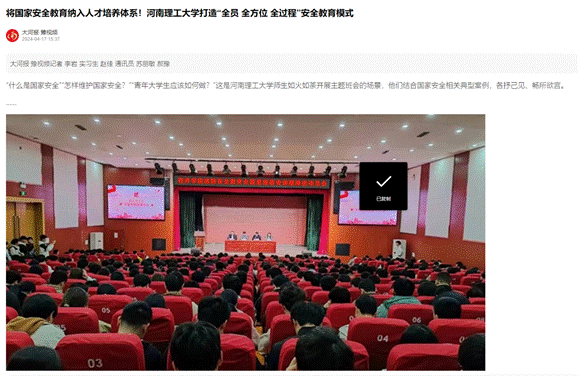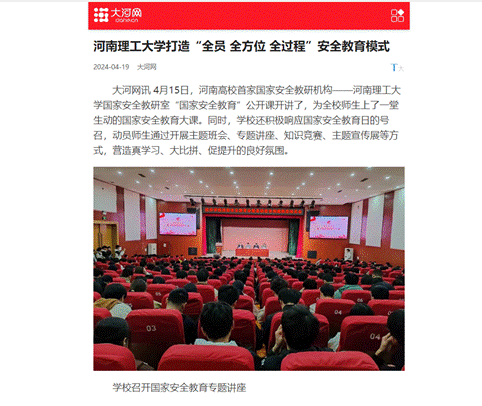 4月15日,河南理工大学国家安全教研室“国家安全教育”公开课开讲了,为全校师生上了一堂生动的国家安全教育大课。学校积极响应国家安全教育日的号召,动员师生通过开展主题班会、专题讲座、知识竞赛、主题宣传展等方式,营造良好的氛围。连日来,光明日报客户端、中国教育报客户端、《中国煤炭报》、河南日报客户端等13家媒体进行了宣传报道,引发热烈反响具体内容如下: