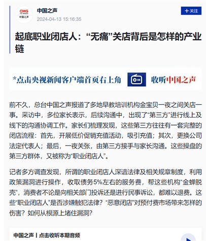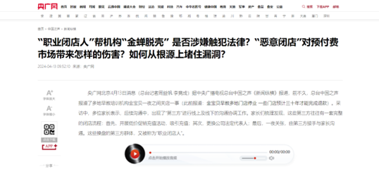 4月13日,央视新闻频道《共同关注》栏目播出了“多家金宝贝闭店 职业闭店人帮‘金蝉脱壳’?”,对近期频发的“背债人”“职业闭店人”现象进行了跟踪报道,期间电话采访了财经学院金融系主任郭明杰,就事件本质做了专业解读。节目在央视新闻频道播出后,中国之声、央广网、新闻纵横等多个媒体连续报道,引发热烈反响。