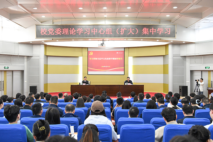 本网讯(记者 马志敏/文 李为群/图)4月12日,学校在力行楼学术报告厅举办党委理论学习中心组(扩大)集中学习会,邀请《百家讲坛》主讲人、河南大学二级教授程遂营作学习贯彻习近平文化思想专题辅导报告。报告会由校党委副书记解伟主持。