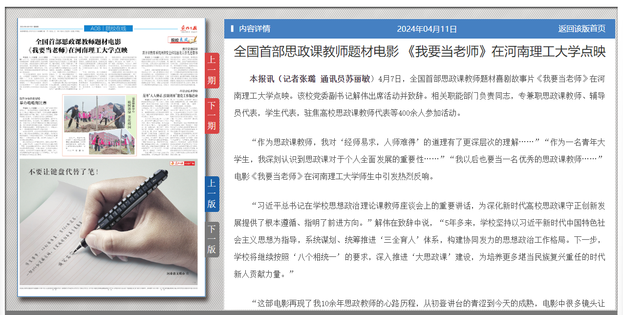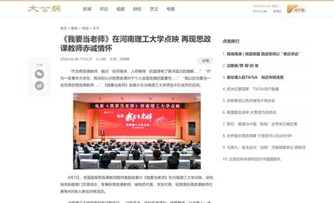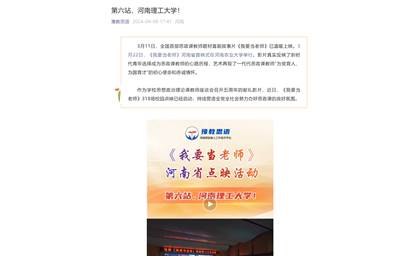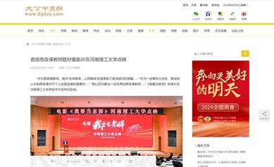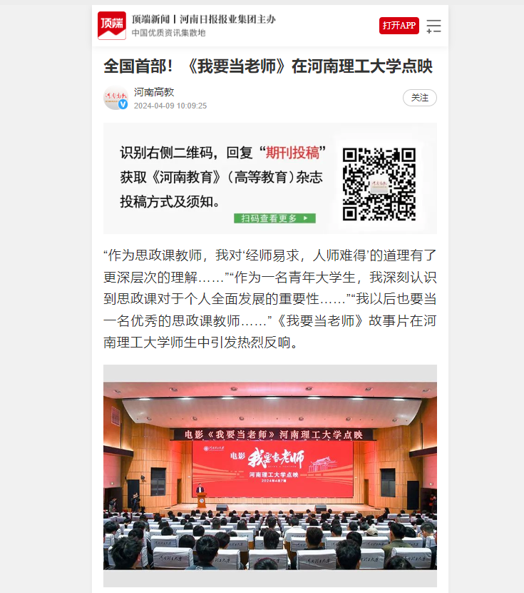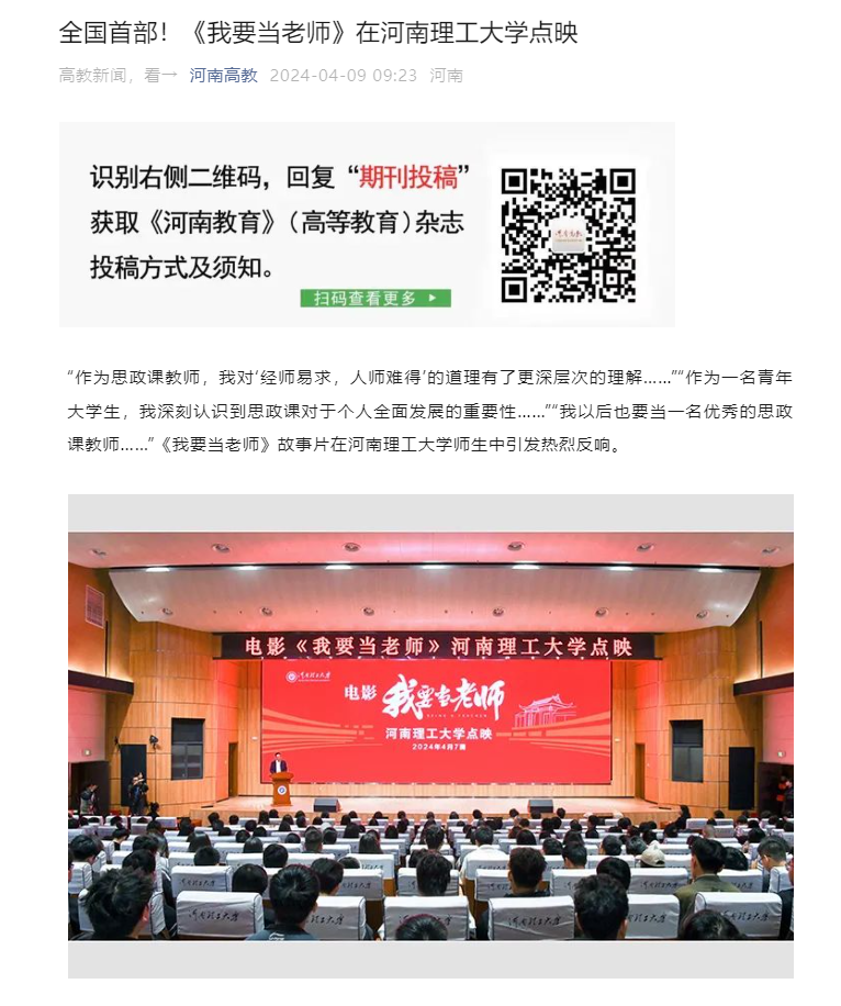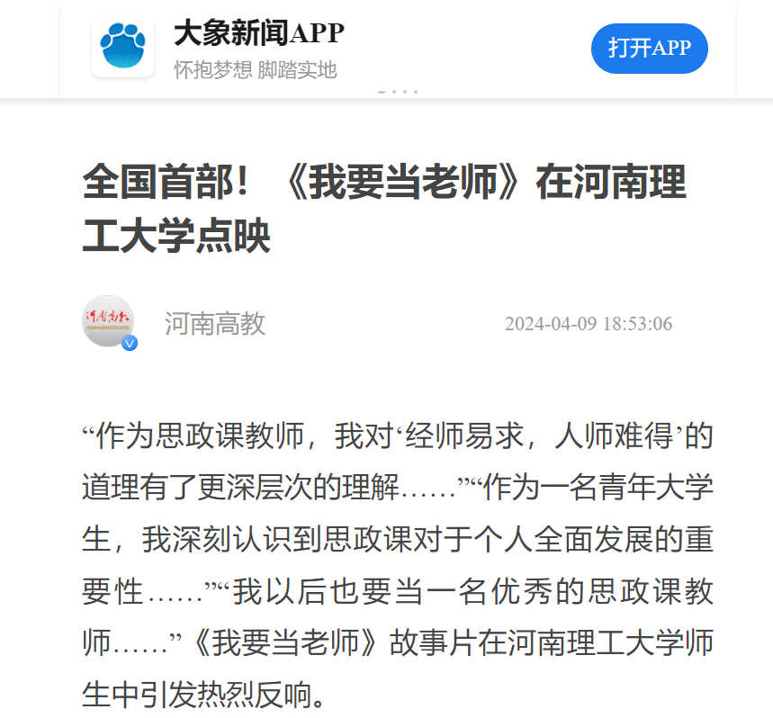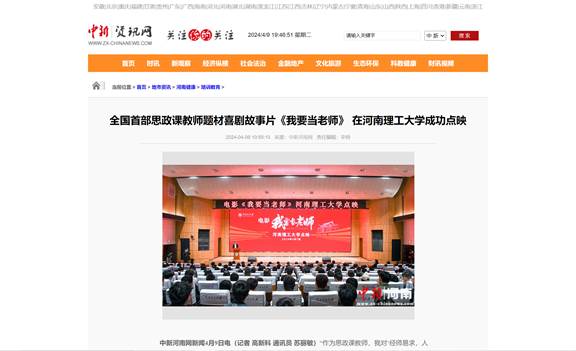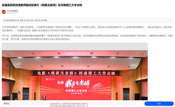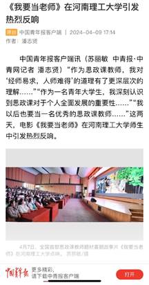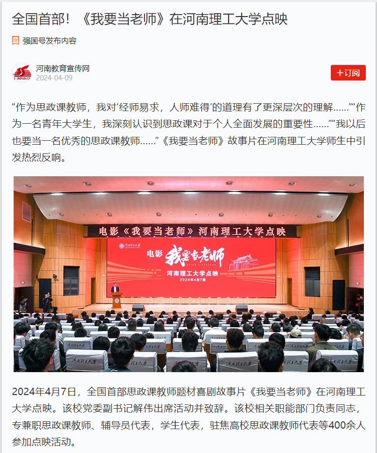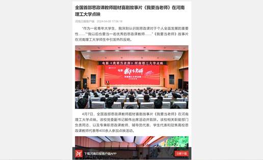 4月7日,全国首部思政课教师题材喜剧故事片《我要当老师》在河南理工大学点映,该影片在学校师生中引发热烈反响。连日来,光明日报客户端、中国青年报客户端、河南日报客户端等17家媒体进行了宣传报道,具体内容如下: