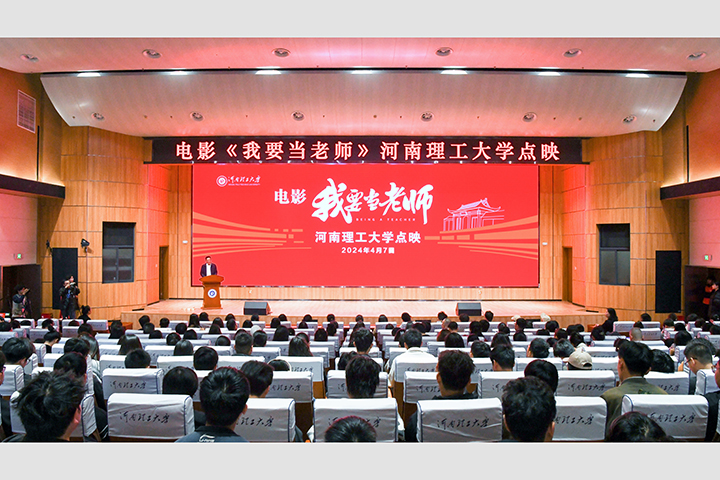 本网讯(记者 苏丽敏/文 李为群/图)4月7日,全国首部思政课教师题材喜剧故事片《我要当老师》在学校南校区第二图书馆点映。校党委副书记解伟出席活动并致辞。党委组织部、党委宣传部、学生工作部(处)、校工会、校团委、教务处等部门负责同志,专兼职思政课教师、辅导员代表,学生代表,驻焦高校思政课教师代表等400余人参加点映活动。