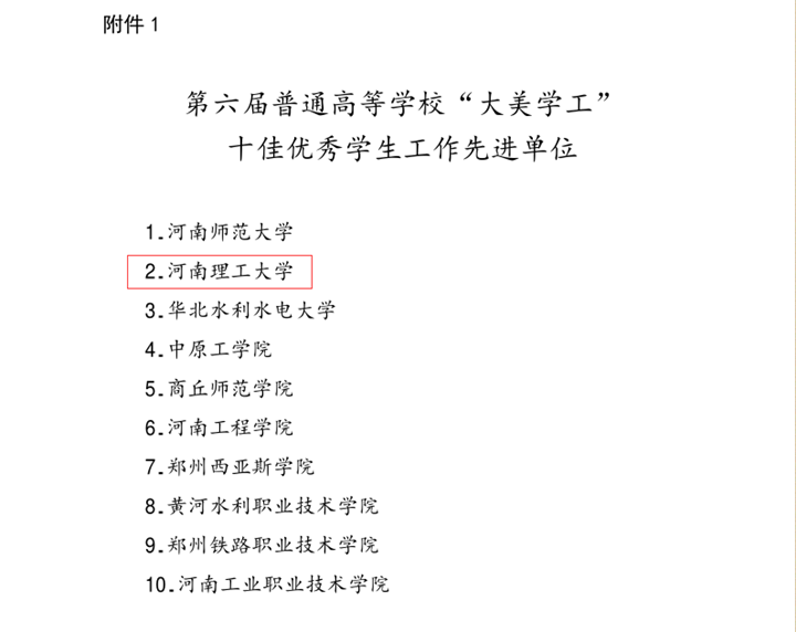 本网讯(通讯员 王晓楠)日前,河南省教育厅下发《关于表彰第六届普通高等学校“大美学工”十佳优秀学生工作先进单位、优秀学生工作品牌和优秀学生工作者的决定》(教学〔2023〕402号),我校喜获河南省第六届“大美学工”十佳优秀学生工作先进单位。