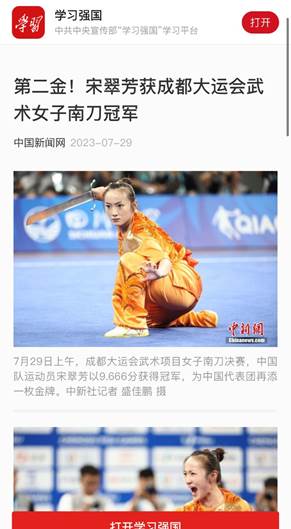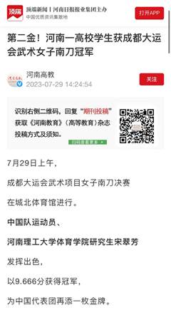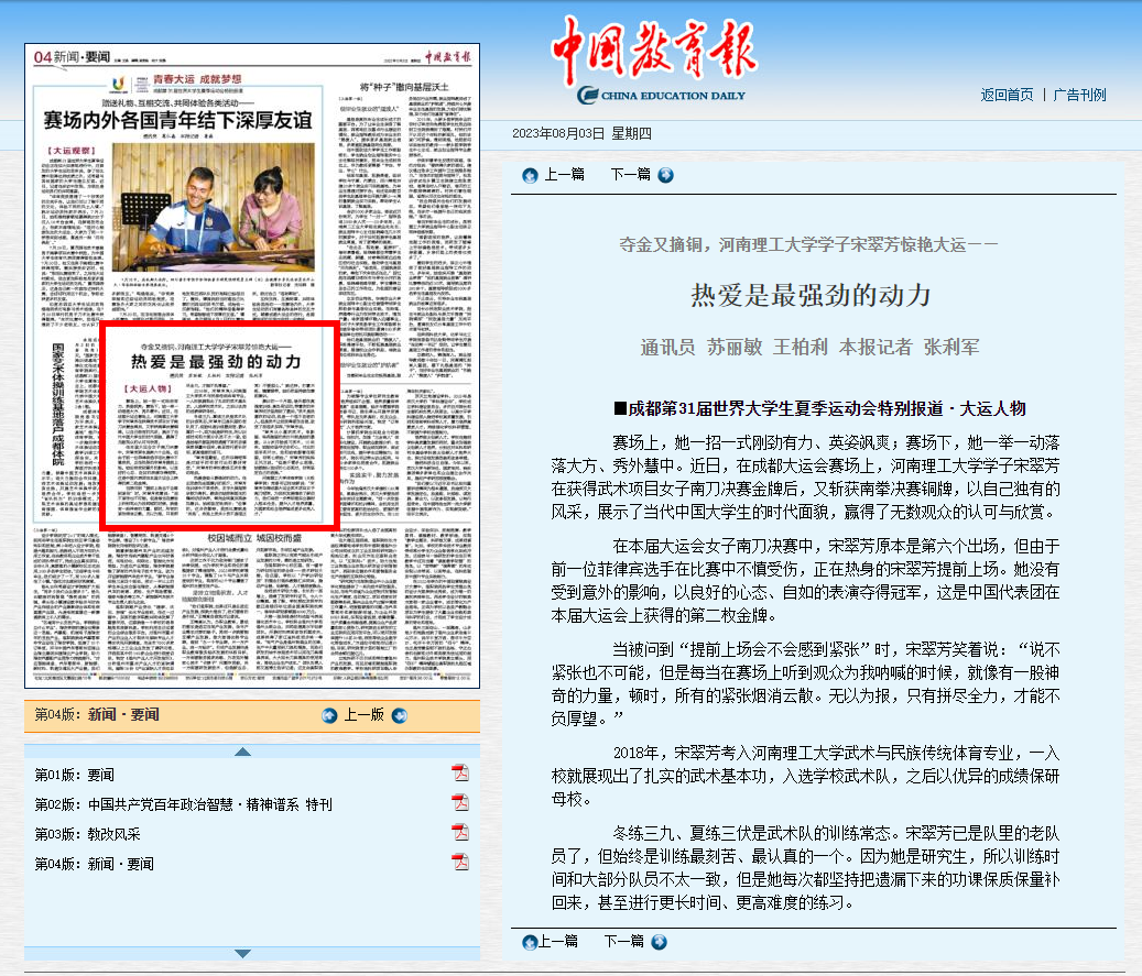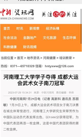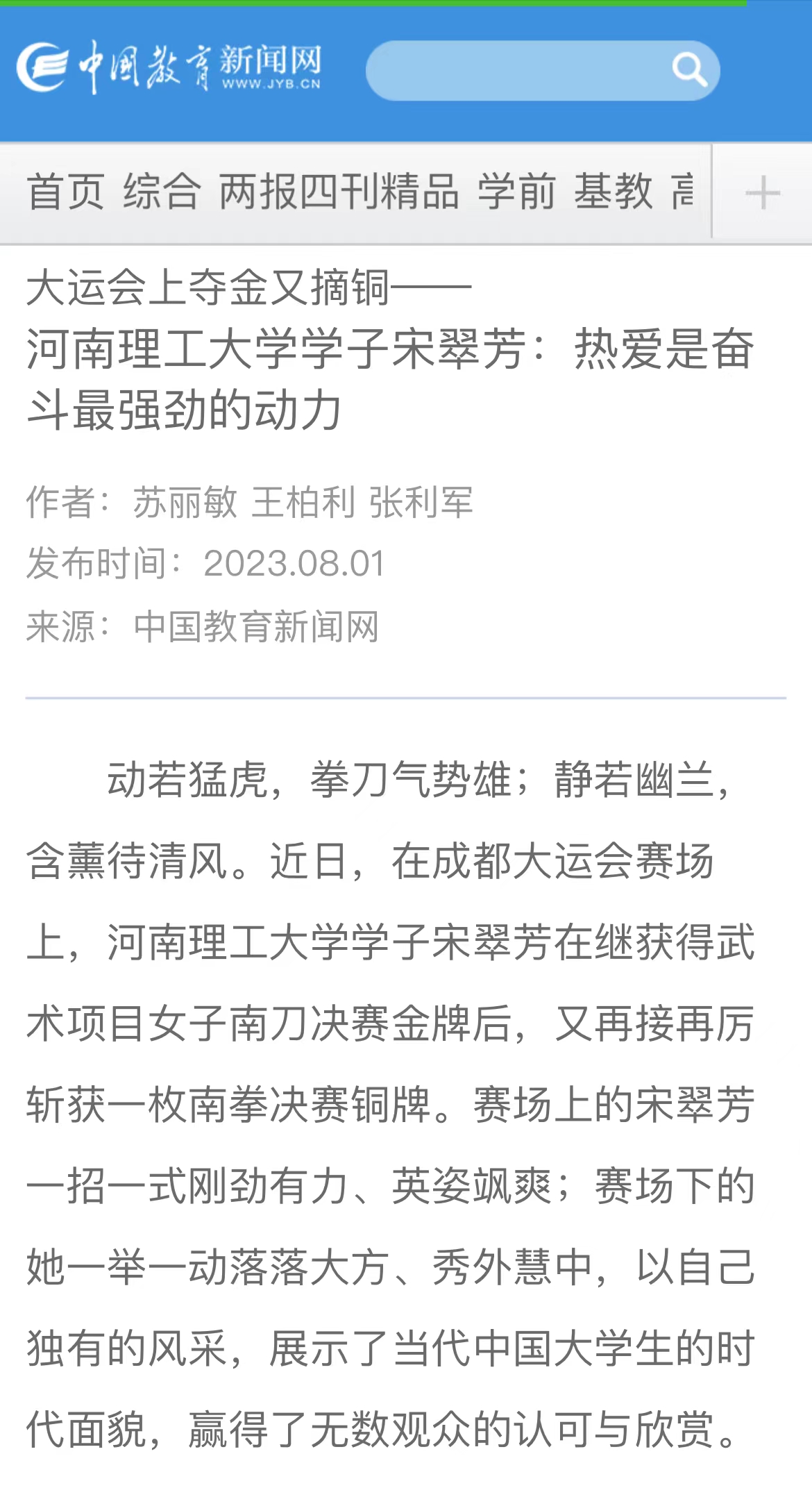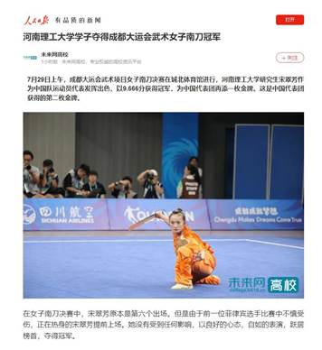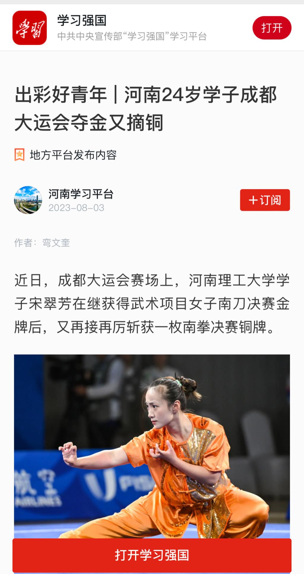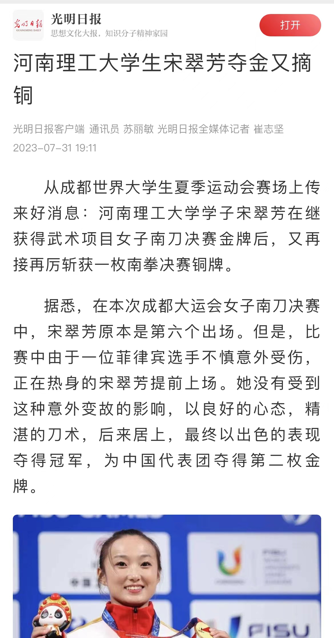 近日,成都大运会赛场上,我校体育学院研究生宋翠芳在继获得武术项目女子南刀决赛金牌后,又再接再厉斩获一枚南拳决赛铜牌。赛场上她以自己独有的风采,展示了河南学子和中国青年的时代面貌,赢得了无数观众的认可与欣赏。党委宣传部围绕成都大运会和宋翠芳同学比赛进展,及时做好内外宣传,相关文章被《中国教育报》《河南日报》、人民日报客户端、光明日报客户端、中国教育新闻网、中国教育电视台、河南日报客户端等20余家媒体宣传报道。同时在学校全媒体平台共发布微信推文、短视频等信息17条,总阅读量达到242万,四次登上微博热搜。相关内容如下: