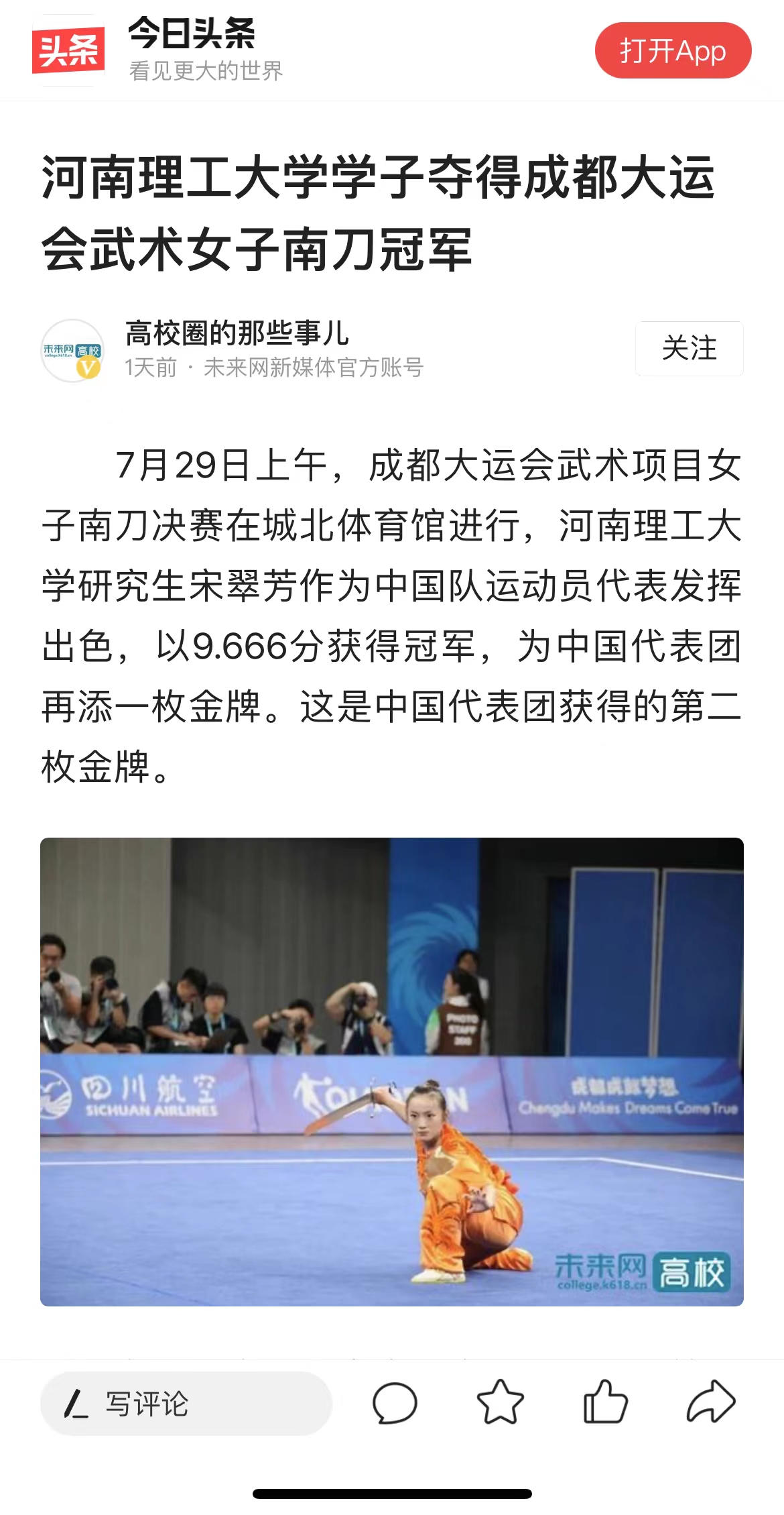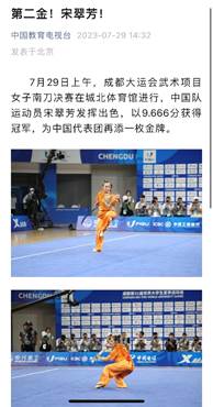 7月29日上午,成都大运会武术项目女子南刀决赛在城北体育馆进行,河南理工大学研究生宋翠芳作为中国队运动员代表发挥出色,以9.666分获得冠军,为中国代表团再添一枚金牌。这是中国代表团获得的第二枚金牌。