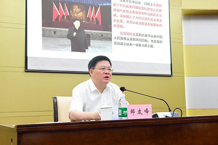 邹友峰指出,党的二十大明确提出以中国式现代化全面推进中华民族伟大复兴的中心任务,概括提出并阐述了中国式现代化理论,这是党的二十大的一个重要理论创新,是科学社会主义的最新重大成果。他要求,全校党员干部要不断深化对中国式现代化理论体系的认识,切实将思想伟力转化为实践力量,奋力推进学校事业更高质量发展。要深刻领会习近平总书记重要讲话的意义,深刻领会加快建设教育强国的战略地位、本质特征、重要任务、根本保证、龙头作用等,把服务国家战略需求作为最高追求,牢记为党育人、为国育才的初心使命,服务高水平科技自立自强和创新驱动发展战略,打造重要人才中心和创新高地,不断提升服务经济社会发展能力。他指出,全校党员干部要深入学习习近平总书记关于中国式现代化、关于教育工作的重要论述,把党的创新理论运用到办学治校实践中,坚持党的全面领导,全面贯彻党的教育方针,牢牢把握社会主义办学方向,把发展科技第一生产力、培养人才第一资源、增强创新第一动力更好结合起来,全面提高人才培养质量,奋力开创学校“双一流”创建新局面。