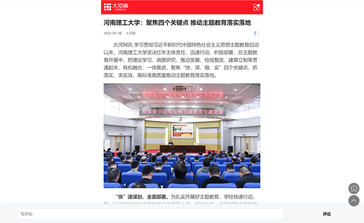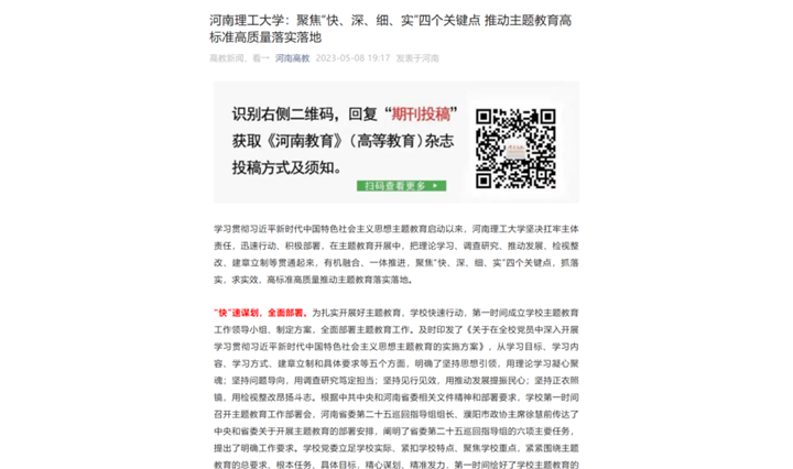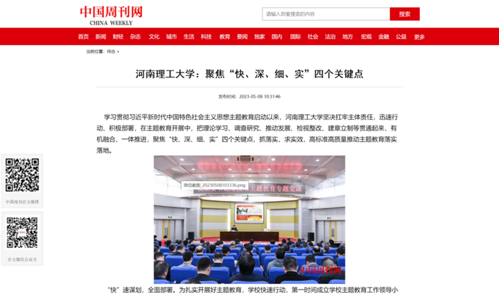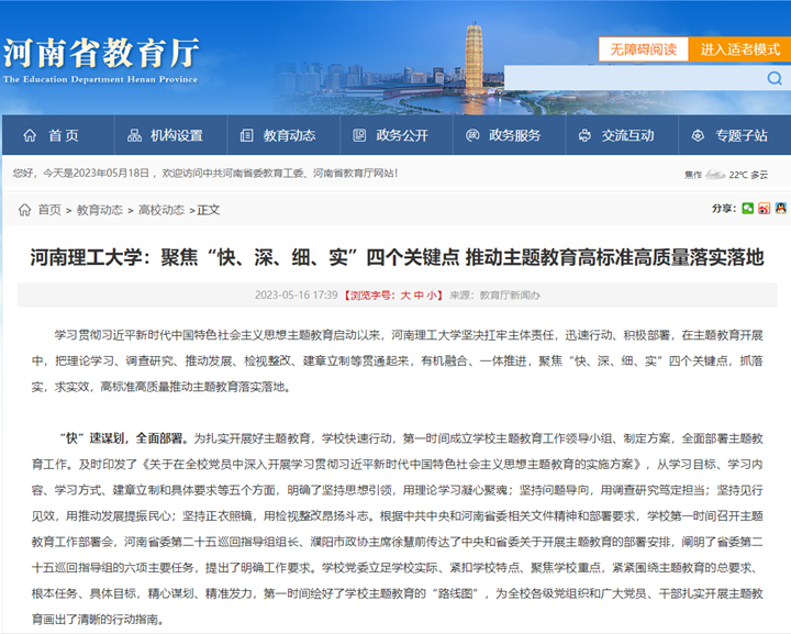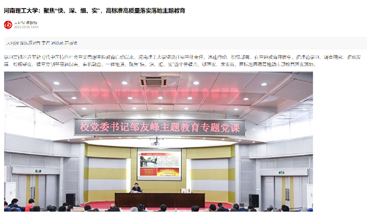 本网讯(记者 苏丽敏 通讯员 雷锦鹏)河南省教育厅官网2023年5月16日以《河南理工大学:聚焦“快、深、细、实”四个关键点 推动主题教育高标准高质量落实落地》为题,报道学校学习贯彻习近平新时代中国特色社会主义思想主题教育启动以来,聚焦“快、深、细、实”四个关键点,抓落实,求实效,高标准高质量推动主题教育落实落地的特色做法。中国周刊网、大河网、中新资讯网、河南教育宣传网等媒体也对此作了报道,相关内容如下:
