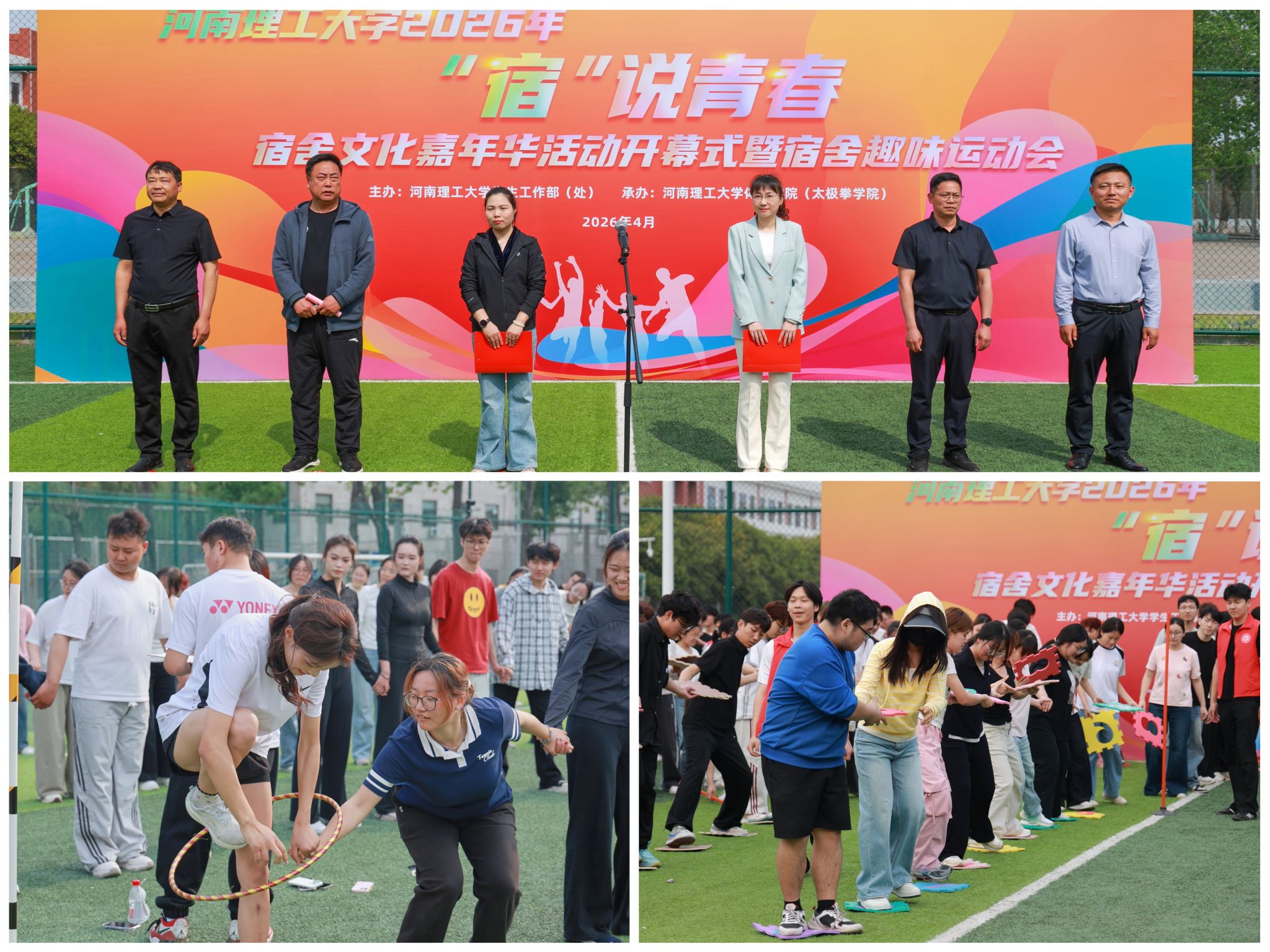 4月14日下午,河南理工大学2026年“‘宿’说青春”宿舍文化嘉年华开幕式暨宿舍趣味运动会在南校区新足球场举行。