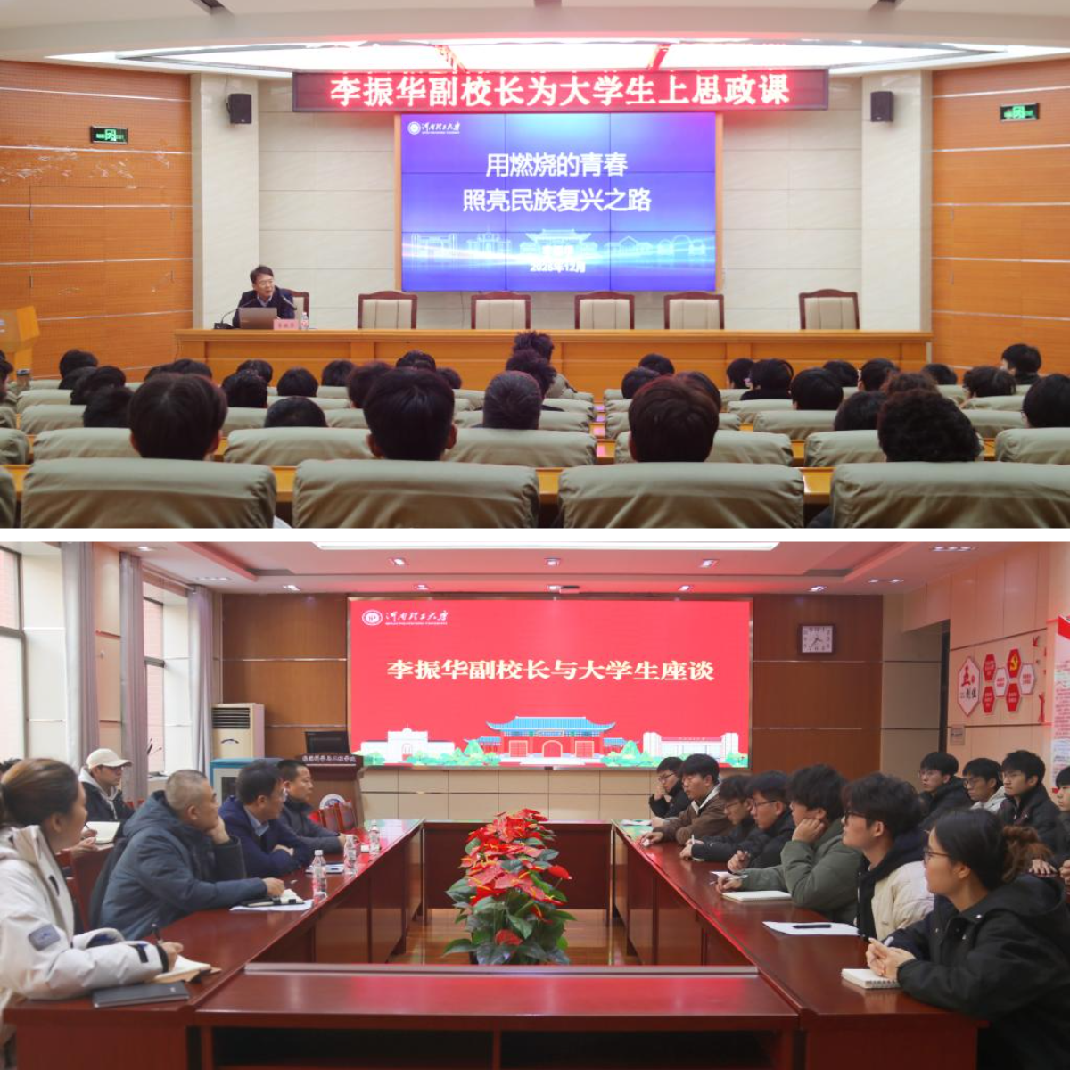 12月16日,李振华副校长在能源学院学术报告厅为该院2023级智能采矿、采矿工程(卓)专业学生讲授题为《用燃烧的青春照亮民族复兴之路》的思政课,并在201会议室与来自该院、材料学院的30名学生代表座谈。